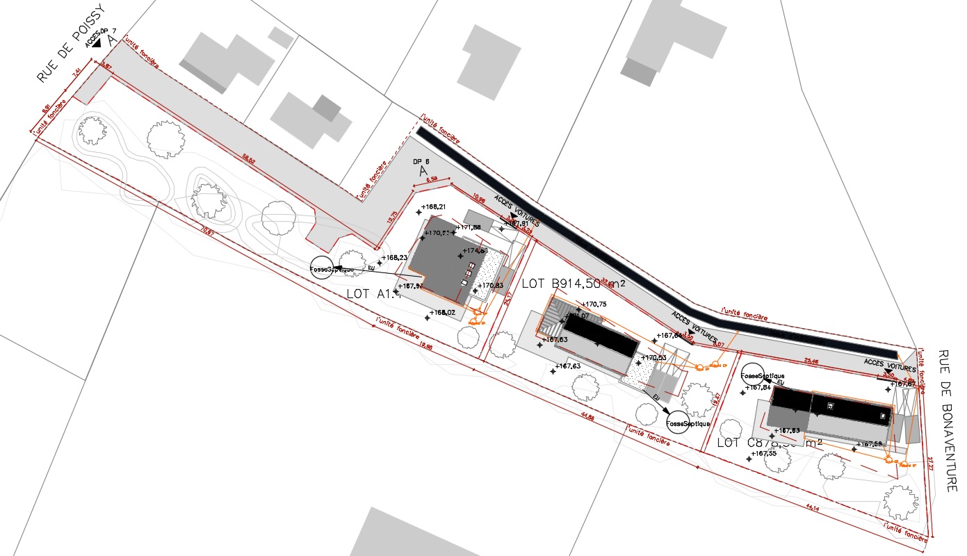 Construction de trois maisons individuelles situées à La Porte Neuve, rue de Bonaventure à Feucherolles (78810), projet réalisé par le bureau d'études SBBM Ingénierie.